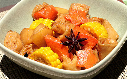 5、重新起油锅,锅热后加入一汤匙油,再加入糖、酱油、大茴香、水,煮出香味后,再加入面肠、红萝卜、白萝卜、甜玉米,以小火红烧至快收干汤汁前,倒入搅拌均匀之玉米粉水,拌匀至收干汤汁后即可熄火盛盘。