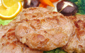 (3) 将素肉丝和香菇丝放入盆中,加入其余材料,一起充分搅拌均匀。将搅拌好的素肉浆平均分为10等份(或自行调整大小),将其搓圆并压扁,放至蒸盘里再整型一下,可在素排的上面用刀背压上一些纹路。