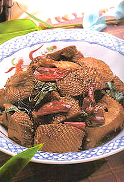 C、放下素鸭块、调味料略炒,再以小火煮至汤汁收乾,在下九层塔翻炒即可。