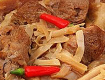 3. 姜末放入香油爆香,再放笋干炒2分钟,再将素肉块、水加上调味料,用大火滚后再用小火炖煮约30分钟,待素肉及笋干皆已入味即可。