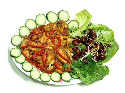 橄榄油于煎锅中以大火预热再将豆腐煎至金黄。然后加入调味料。搅拌均匀。加入切碎的青葱和红辣椒。再搅拌一次然后装盘。