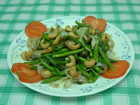 2.起镬落油,放入海鲜菇、芦笋兜炒片刻