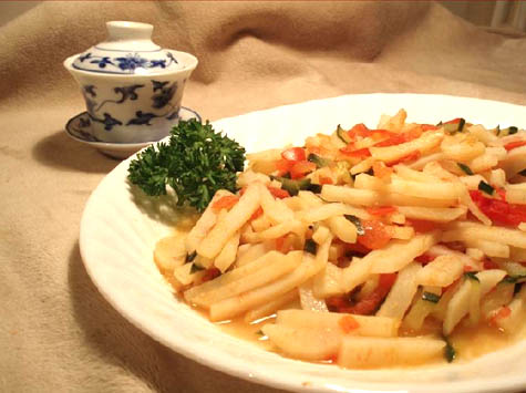 2个马铃薯,切成条; 1/2 条小黄瓜,切成细条; 2颗蕃茄,切成条不要让果汁流失