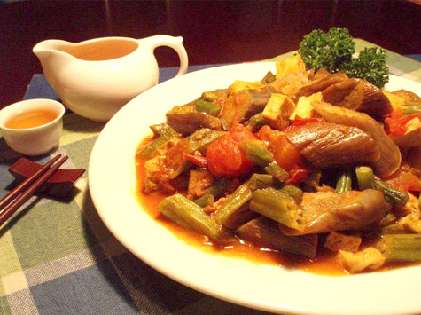 3条茄子, 5条秋葵, 2个蕃茄, 1块硬豆腐,姜, 4大匙油, 30克咖哩粉,盐,酱油