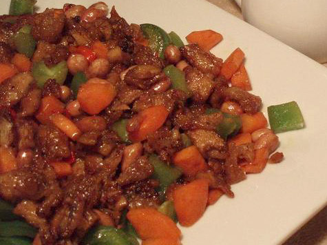 500克素盐酥鸡切丁, 2个大青椒切丁, 2个胡萝卜切丁, 1杯冷冻嫩豌豆, 1/2杯炒熟的花生(用油将生花生炒脆)