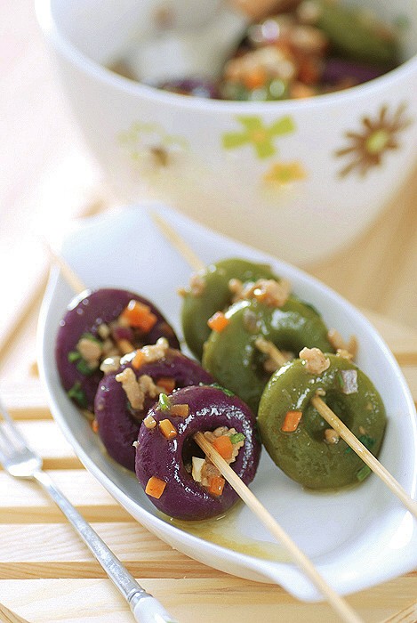 5、绿团揪一块(约10g左右),滚圆,稍按扁,用茶壶盖类似的小钮在中间按压做成算盘子。其他颜色的和绿团做法一样。开水入锅,分别煮至飘起捞出。