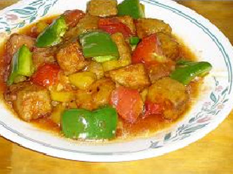 3. 热锅加油略炒蕃茄和凤梨,加入酱料、素火腿丁和青椒丁煮至酱汁浓稠后即可。