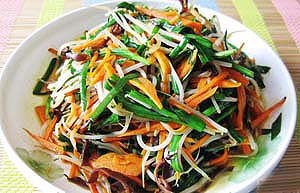 主料:绿豆芽(芽菜)一把、胡萝卜一小段、木耳几朵泡发