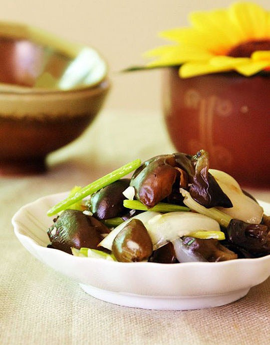 原料:黑木耳一把,百合一头,本地芹菜5根,盐适量,香油3ML