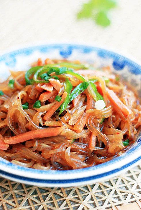 3、反复翻炒到萝卜丝变软后,加入少许盐、半匙老抽、半匙陈醋调味,将红薯粉条从水中捞出加入锅中,加半碗水,并翻炒均匀;