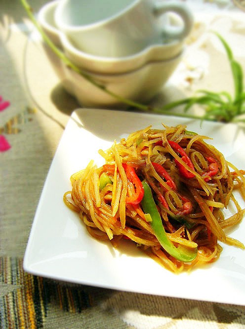 6.炒到土豆丝断生,关火,淋香油、味精,出锅