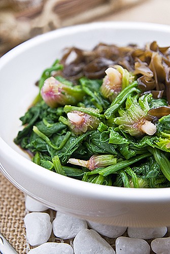 【材料】菠菜、黑木耳、盐、糖、陈醋、香油、味精、辣椒油