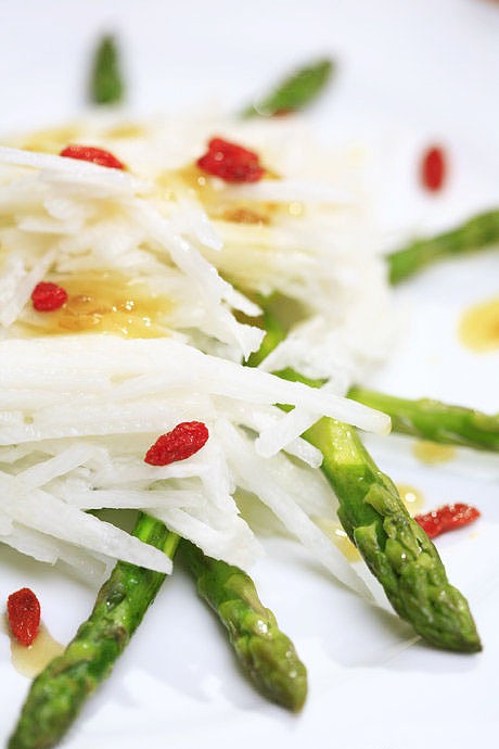 5、将芦笋码放在盘中,山药丝撒在上面,最后淋上刚才调制的汁。