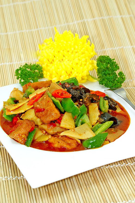 (8)锅内加入少许精制油,倒入生姜末、红杭椒片煸香,然后放入郫县豆瓣酱继续煸炒出红油。放黑木耳以及滑油过的冬笋片、平菇块、豆腐块,加一杯清水调入少许盐、老抽,略微煮一会儿(让豆腐入味),最后放蘑菇精(代替味精)青甜椒块炒匀,勾一点点薄芡,淋一二滴香油,拌匀起锅,盛入盘内稍摆盘即可。