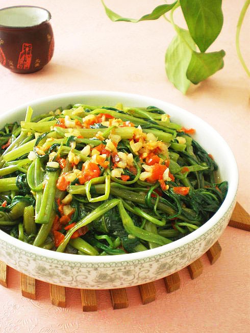 1.空心菜择取嫩的部分,洗净后沥干;红泡椒剁碎成末,生姜切成末;