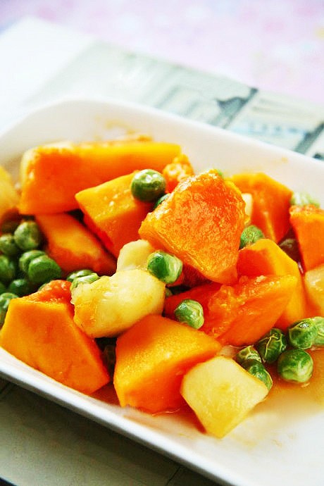 1、将木瓜去皮去籽,切成块,马蹄削去外皮切丁,豌豆洗净