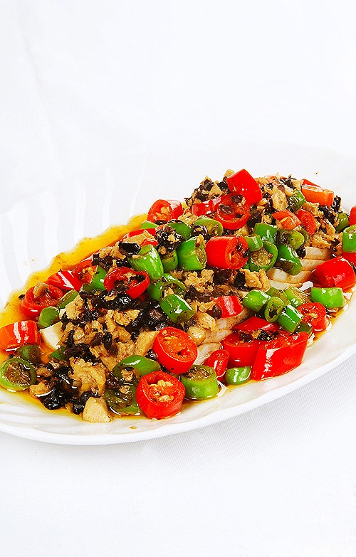 8.起锅,锅中倒入少许初榨橄榄油,放入青红杭椒圈煸香,放步骤(6)的料另一半煸透,加美极酱油调味,煸炒,淋少许水炒香倒出,淋在蒸好的千叶豆腐之上即可。