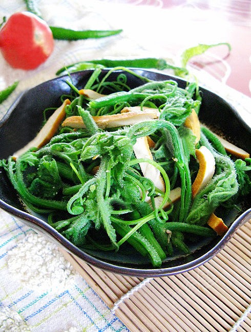 3、热锅凉油放入香干&瓜藤翻炒均匀,放入两茶勺水盖锅盖焖半分钟,起锅前撒入适量的食盐即
