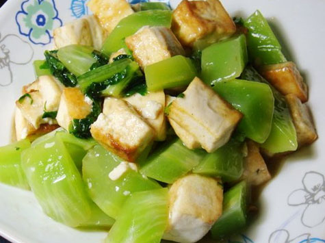 1、豆腐切方块,用少量油煎成金黄色备用。莴苣切成滚刀块,叶子切段。