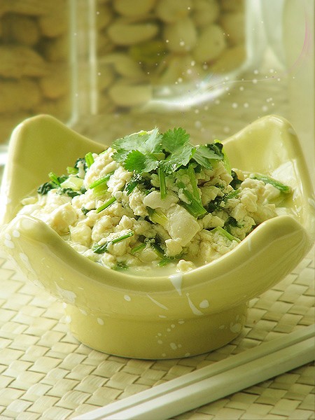 3:用铲子边炒边铲碎豆腐,加入盐调味。