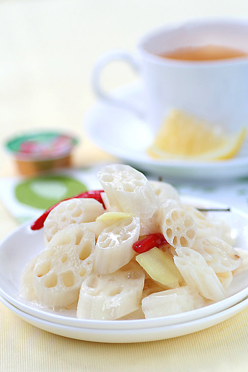 3)锅烧热倒入油,待油7成热时,放入红椒和姜片爆香,倒入藕带翻炒1分钟后,调入白醋和盐搅拌均匀,盖上盖子用中火焖1分钟,打开后转大火翻炒半分钟即可。