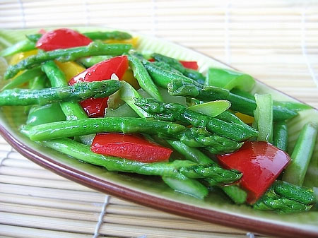 3)倒入芦笋煸炒2分钟,随后再将彩椒放入继续翻炒1分钟,加盐,加蘑菇精即可。