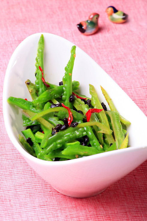 4、苦瓜、尖椒、干辣椒、豆豉拌匀加盐、蘑菇精、白糖、醋、调味拌匀,放入烤盘用烤箱烤5分钟取出装盘即可。