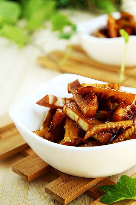 3、锅中油热后,放入笋片,翻炒均匀,生抽、少许老抽调色、白糖翻炒均匀;