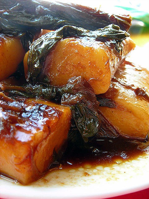 材料:天菜心、老抽、芝麻油、干辣椒、盐、糖,蘑菇精,年糕(水磨或火锅年糕)。