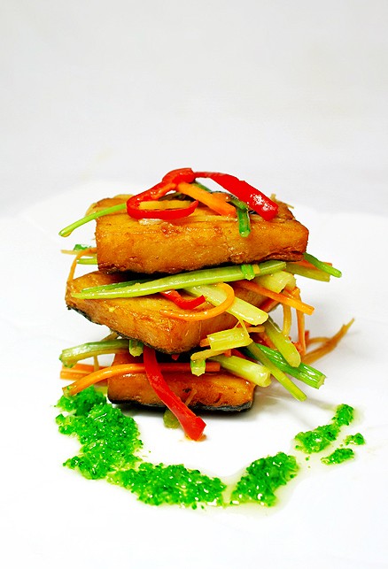 5.净锅内留少许精制油,煸香姜丝、红椒丝、胡萝卜丝、芹菜段,然后放入炸成金黄色素鱼块,继续煸炒,淋美极鲜味汁、蘑菇精、芫荽段煸炒入味,干身后出锅装盘。OK啦!