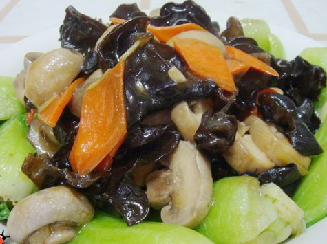 原料:菜胆(也叫上海青)、干木耳、胡萝卜、草菇、口蘑(也叫白蘑菇)