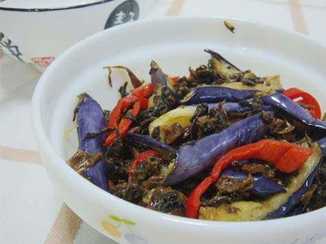 2、起锅热油,爆姜丝,放入霉干菜和红尖椒翻炒,炒至霉干菜变软后,再倒入茄子,并淋上酱油,用酱油的汁焖着茄子和霉干菜,使其入味,最后加蘑菇精即可出锅。