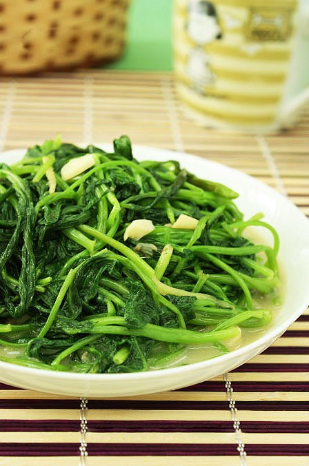 3.放入空心菜叶子,大火快速翻炒至空心菜变色;