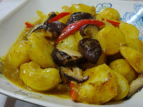 3、起锅热油,倒入香菇炒香后,加入红尖椒丝、咖喱油(或是咖喱粉)翻炒,加少许开水将咖喱搅匀,马上放入煮好的小土豆,待土豆裹匀咖喱后即可出锅。