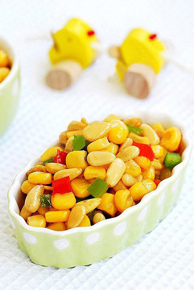 【材料】罐装甜玉米粒160克,松子仁50克,青、红椒各25克