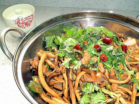 6、将茶树菇移入小锅,撒香菜,点火,三分钟以后就可以吃喽。