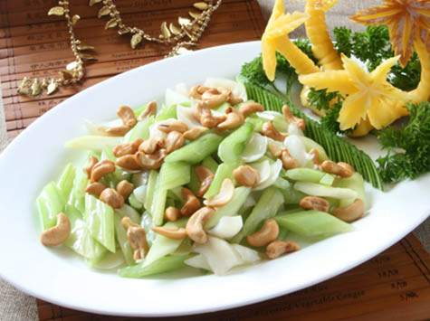 (1)西芹洗净削皮,切成菱形块;百合掰开洗净;腰果用油炸熟备用;