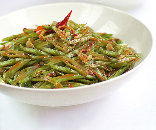 原料:豆角500克姜丝少许干红辣椒10颗 郫县辣酱3汤匙(45克) 糖1茶匙(5克)蘑菇精1/2茶匙(3克)