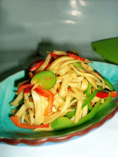 【说明】放青椒和红椒后,锅不要盖盖儿,以免彩椒变了颜色,不绿也不红艳了!