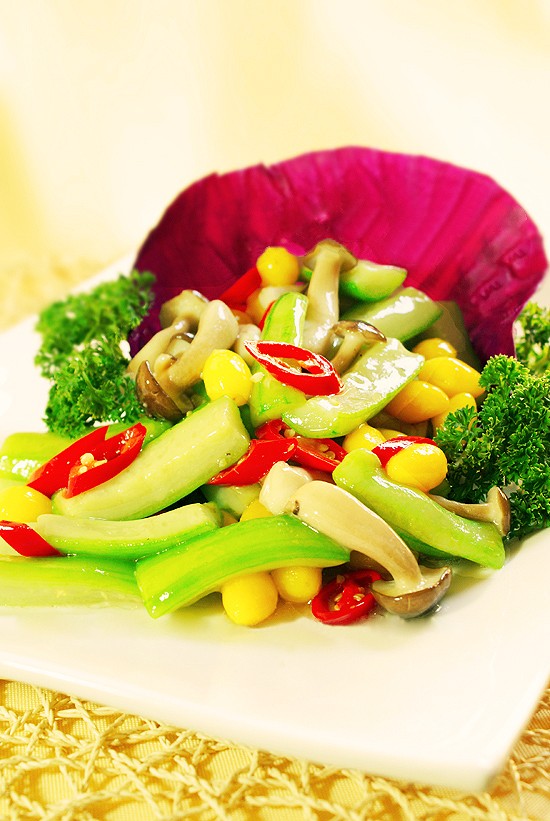 原料:蟹味菇、丝瓜、银杏、紫甘蓝、红尖辣