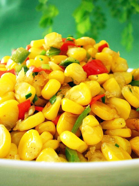 4.锅内留少许油,下入青红椒与姜末,翻炒一分钟后下入炸好的玉米粒炒匀;