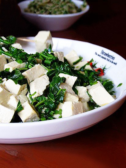 8、把切碎的香椿撒在焯水的豆腐上,然后淋入碗汁即可。