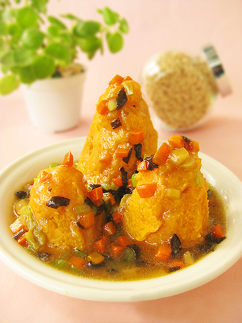 2、各种配菜切成小粒,炒锅烧热,倒油,放入各种配菜煸炒,然后放入素蚝油、生抽、糖,最后放入水淀粉勾芡。将配料浇在“黄山”上即可。