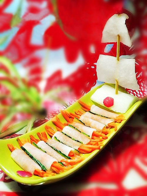 3、白萝卜洗净,用去皮刀削成纸一样的薄片。