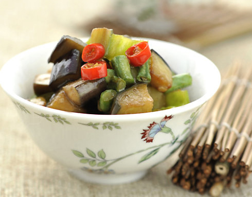 1、豇豆洗净,切成1厘米长的粒。青椒切块,小红椒切片。将茄子去蒂洗净,切成2厘米大小的丁。