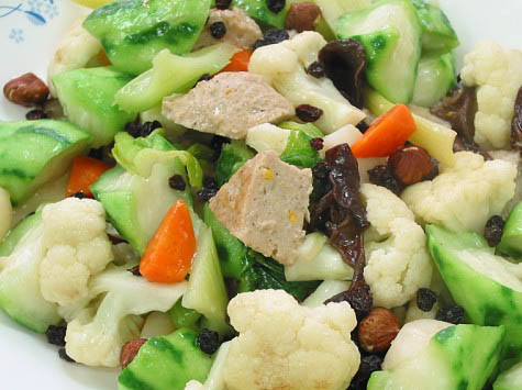 3. 然后用姜及油起锅,放入头六样材料炒,下调味料水兜匀,最后放入提子干及果仁,上碟即可。
