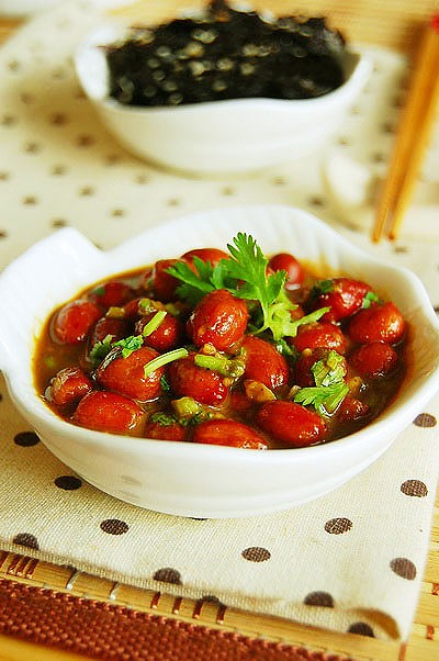 1、花生仁和冷油一起下锅,小火慢炒至表皮颜色变深,捞起晾凉
