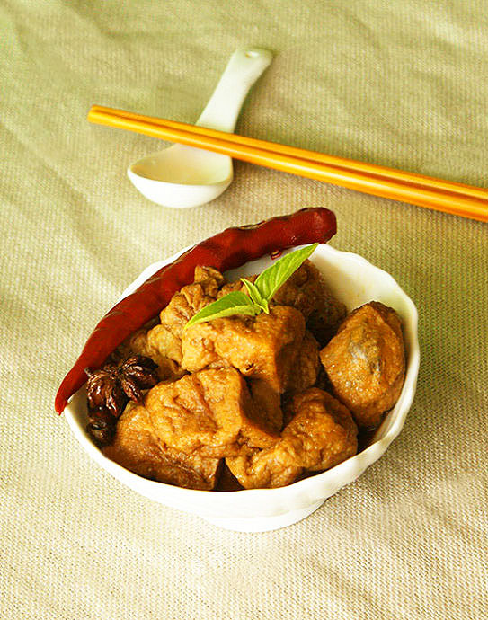 1、油豆泡放入锅中,加入清水1000ML,大火煮开,放入除蜂蜜和香油以外的所有调味料,煮10分钟后,小火焖煮到汤汁收浓。