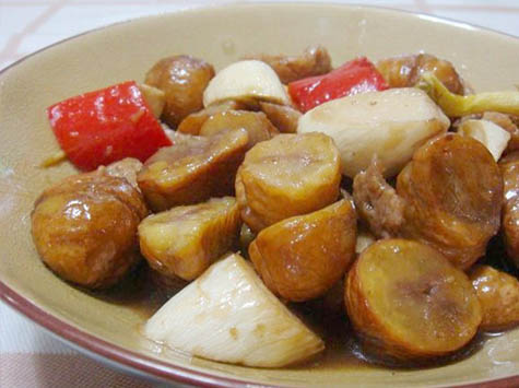 原料:板栗、茭白、大豆蛋白、红菜椒