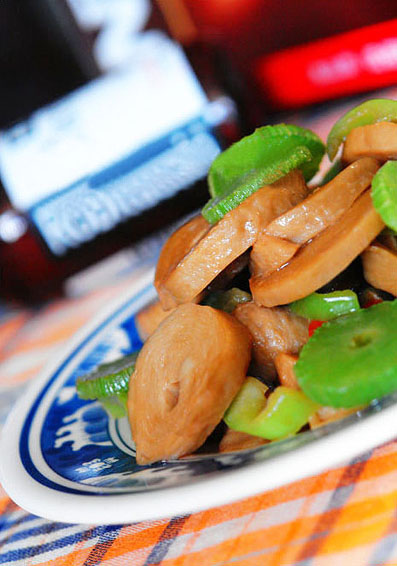 3.加少许油,烧热加入改刀后的素常翻炒,加入少许盐,生抽,老抽调味。翻炒出香味后,加入水,汤汁一定要没过素肠。然后盖盖转中小火焖烧3-4分钟。然后加入辣椒与莴笋翻炒1分钟即可出锅。